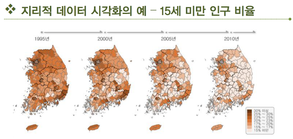 지리적 데이터의 시각화는 지역과 관련된 데이터를 지도와 함께 색으로 표시하여 패턴과 경향을 파악한다.