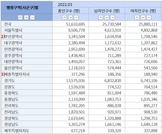 지리적 데이터의 예(kosis.kr, 행정구역별 성별인구수 2022.3 )